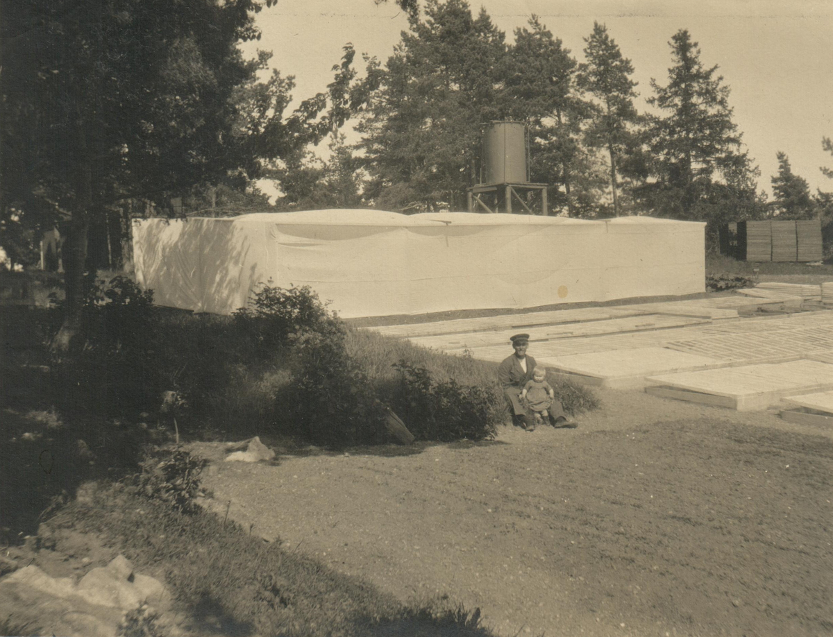 En tobaksodlare och hans barn sitter vid "Sveriges första skuggodling" i Prästnibble 1924.