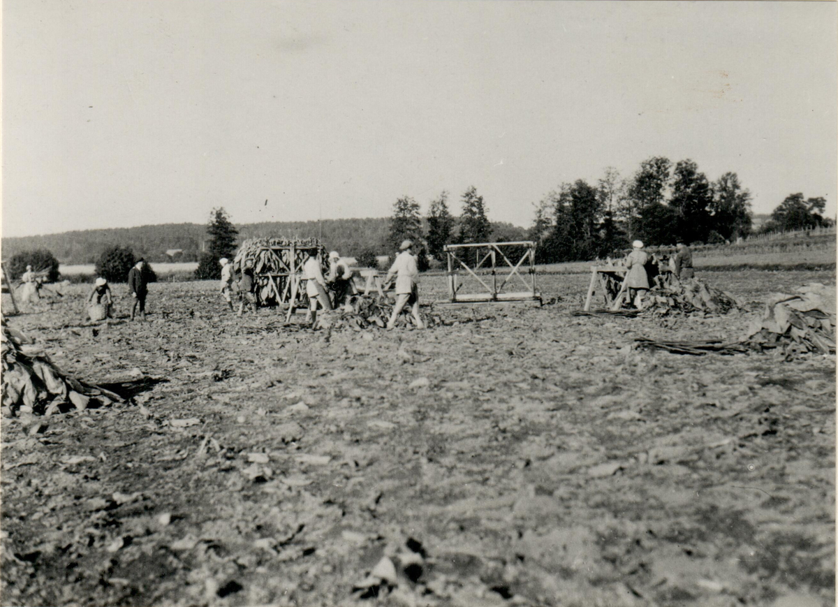 Tobaken överflyttas till torkställningar, för att sedan transporteras till en torklada. Prästnibble 1920-tal.