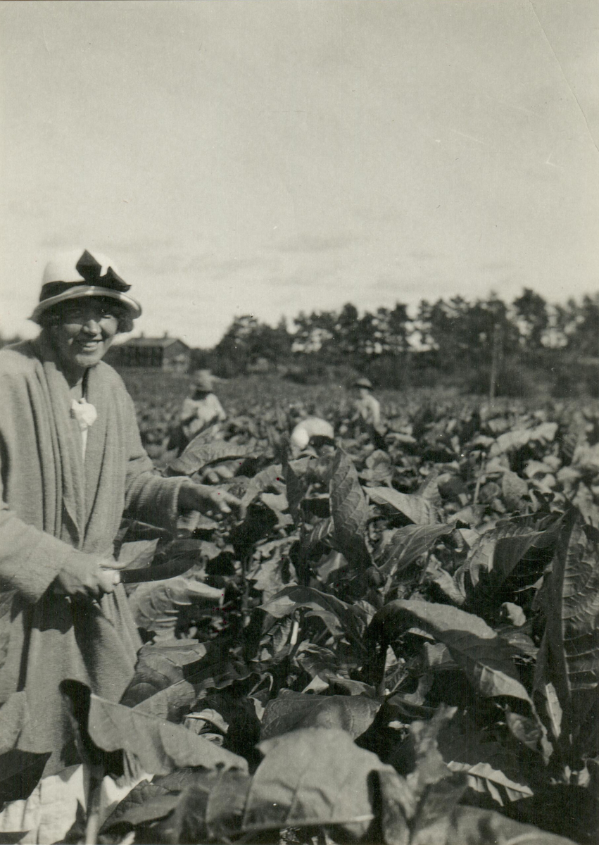 En kvinnlig tobaksodlare klyver tobaksplantor med en speciell kniv. Tobaksodling i Sverige.