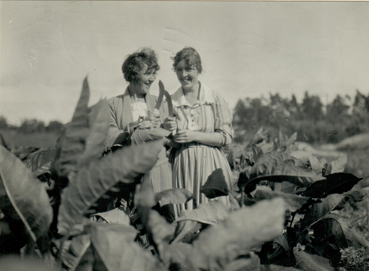 Två kvinnliga tobaksodlare står i ett tobaksfält i Sverige.