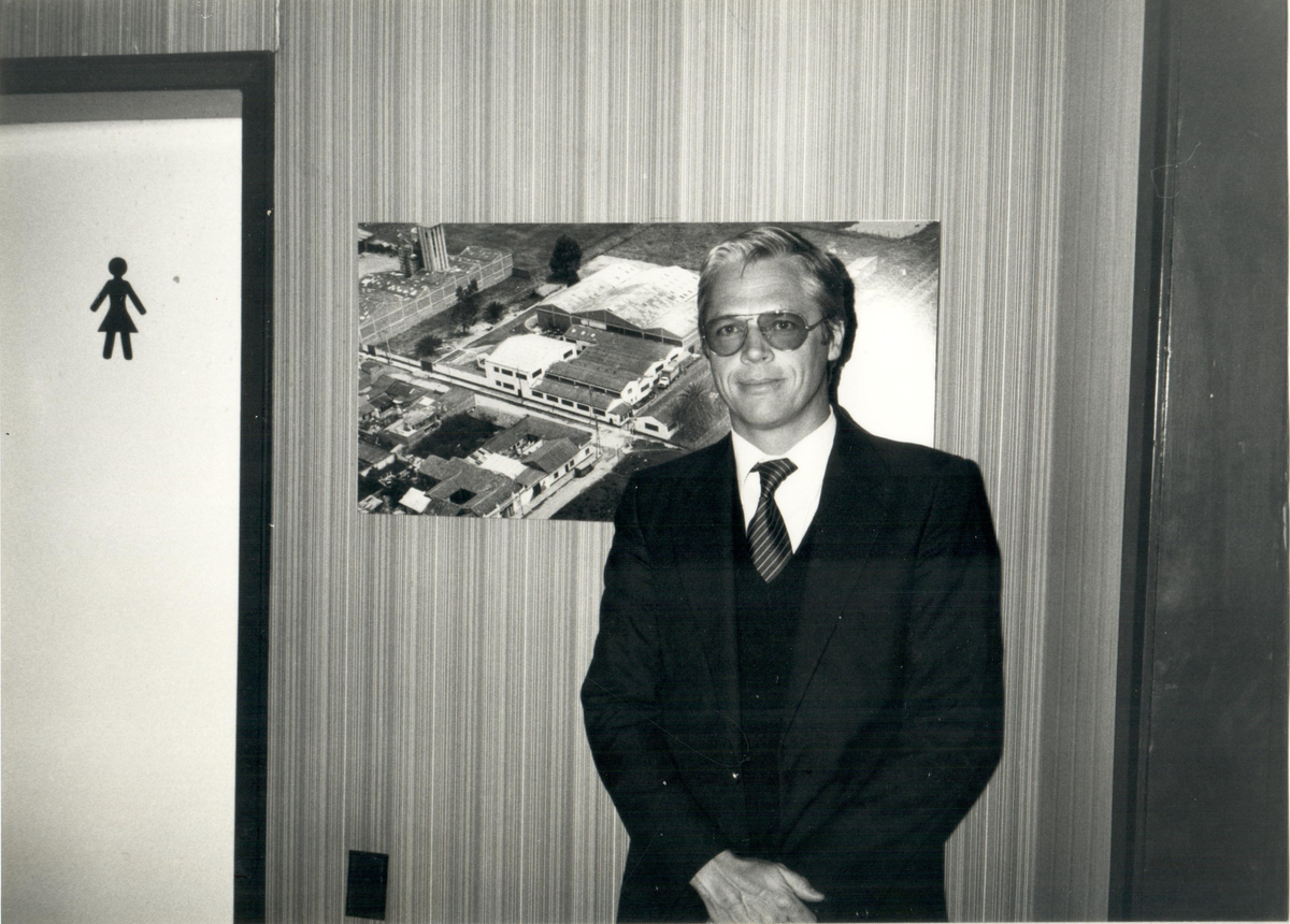 Man står uppställd för bild. Fabriken i Mosquera på plansch i bakgrunden.
