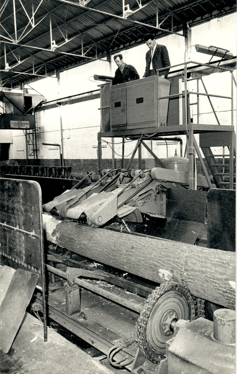 Barkningsmaskin inuti Union Allumettiere, tändsticksfabriken i Overboelare.