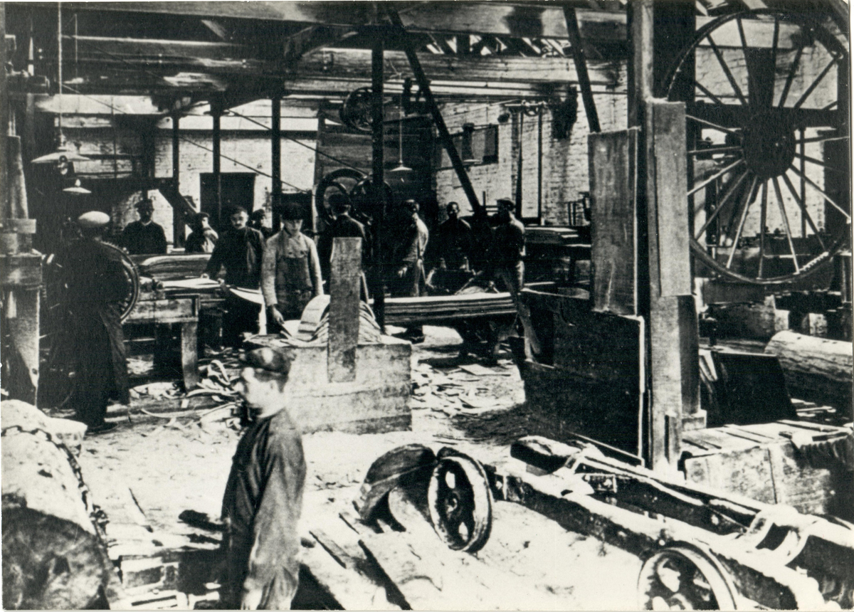 "Skalningsavdelningen" inuti Union Allumettiere, tändsticksfabriken i Overboelare.