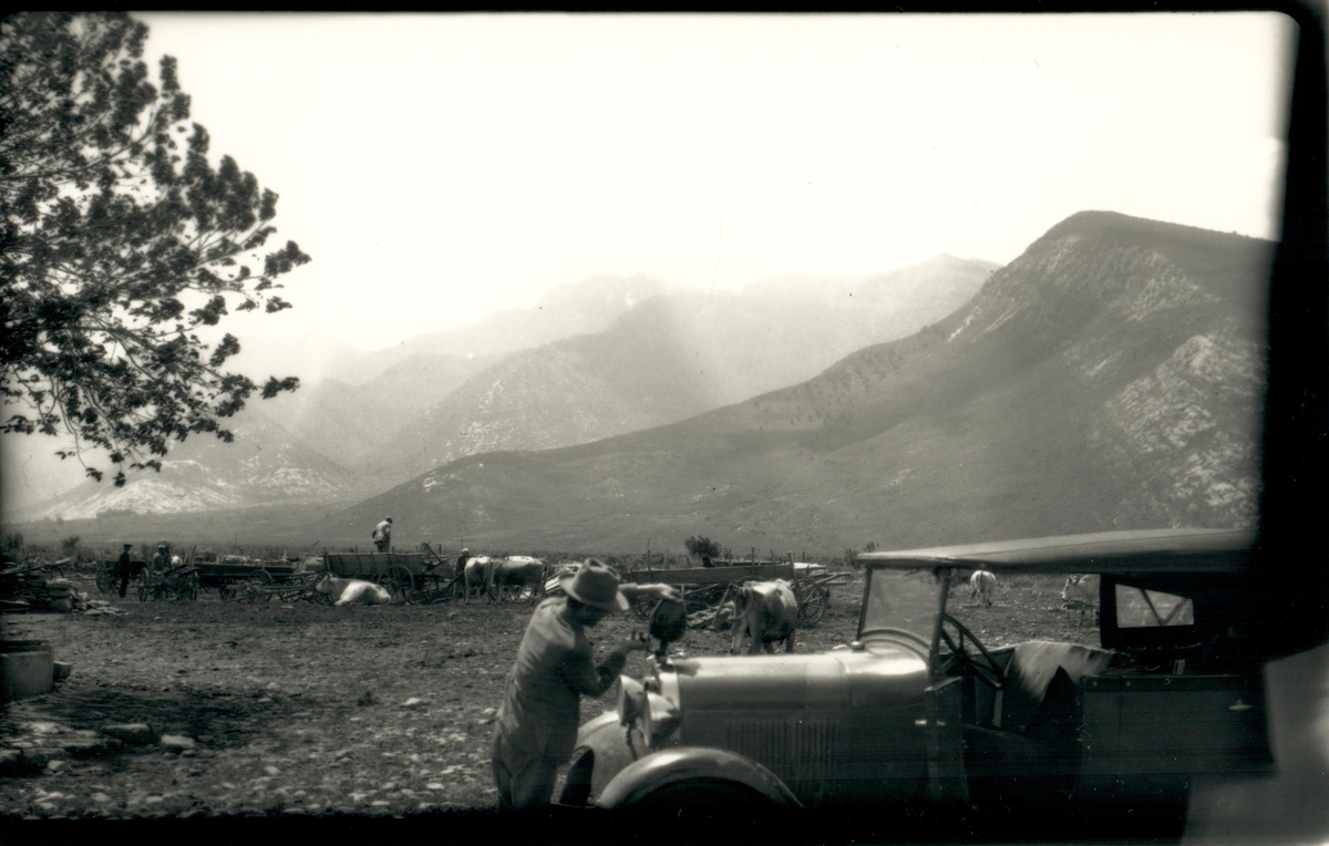 Bilkylare påfylls med vatten. Bergslandskap i bakgrunden.