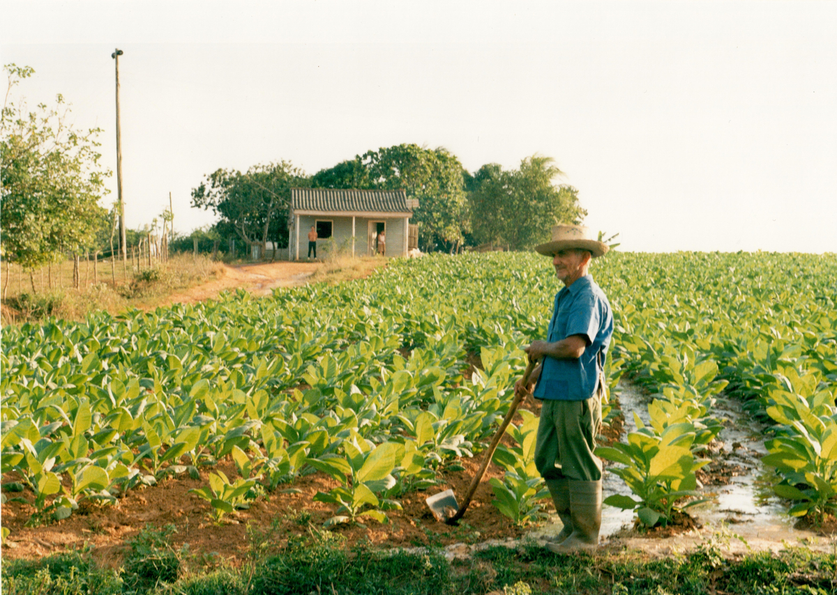 En kubansk odlare står vid en tobaksodling med en planteringshacka.
