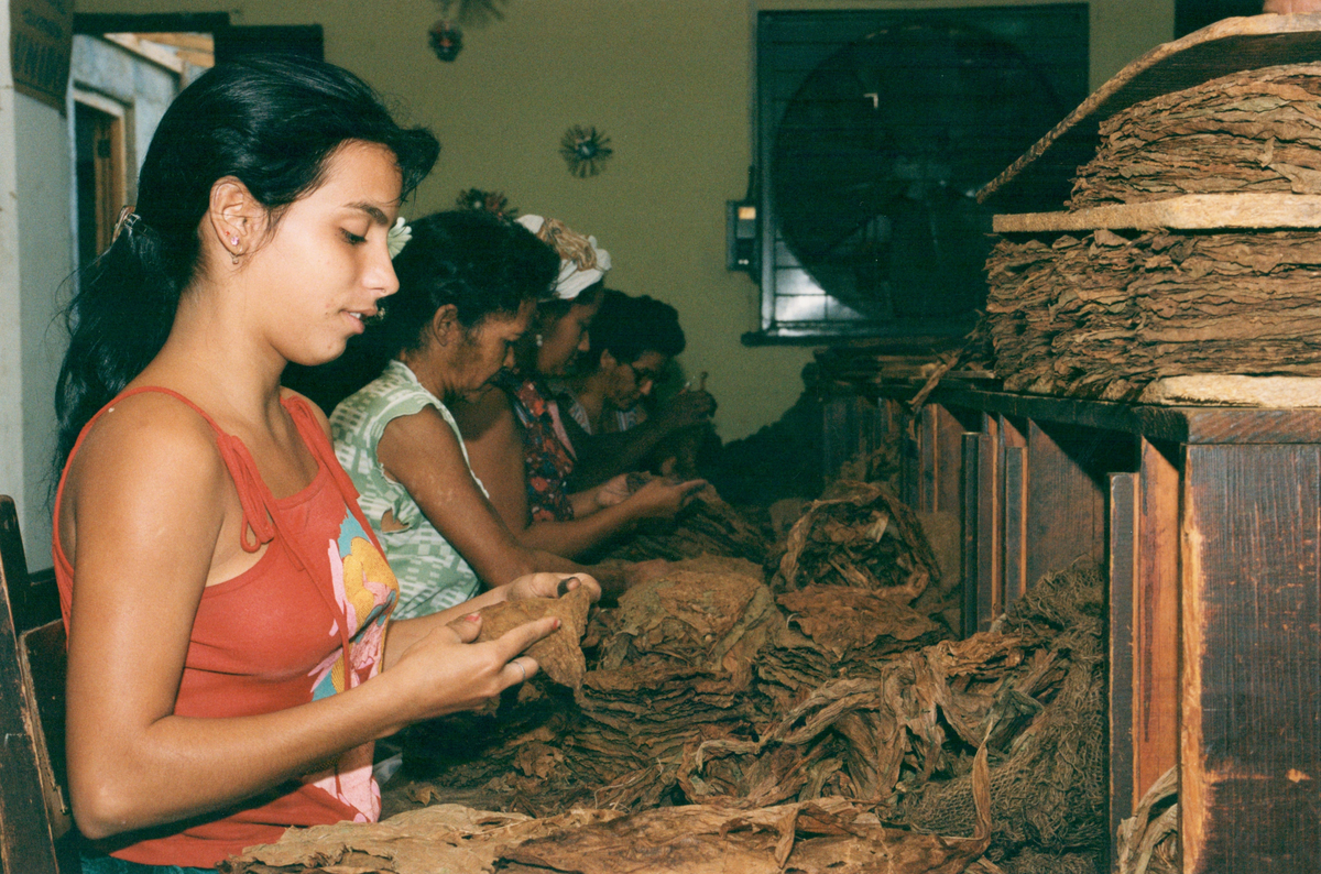 Torkad tobak hanteras inuti en kubansk cigarrfabrik.