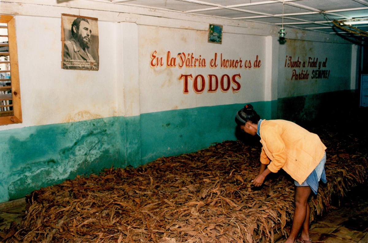 Torkad tobak hanteras inuti en kubansk cigarrfabrik.