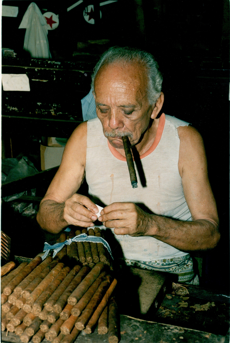 En man med cigarr i munnen slår in cigarrer i buntar inuti en kubansk cigarrfabrik.
