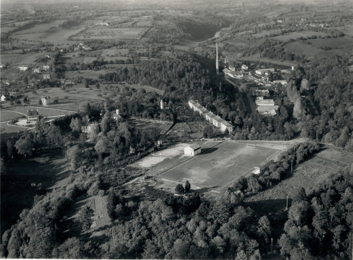 Flygfoto över en fotbollsplan intill ett industriområde i Frankrike.