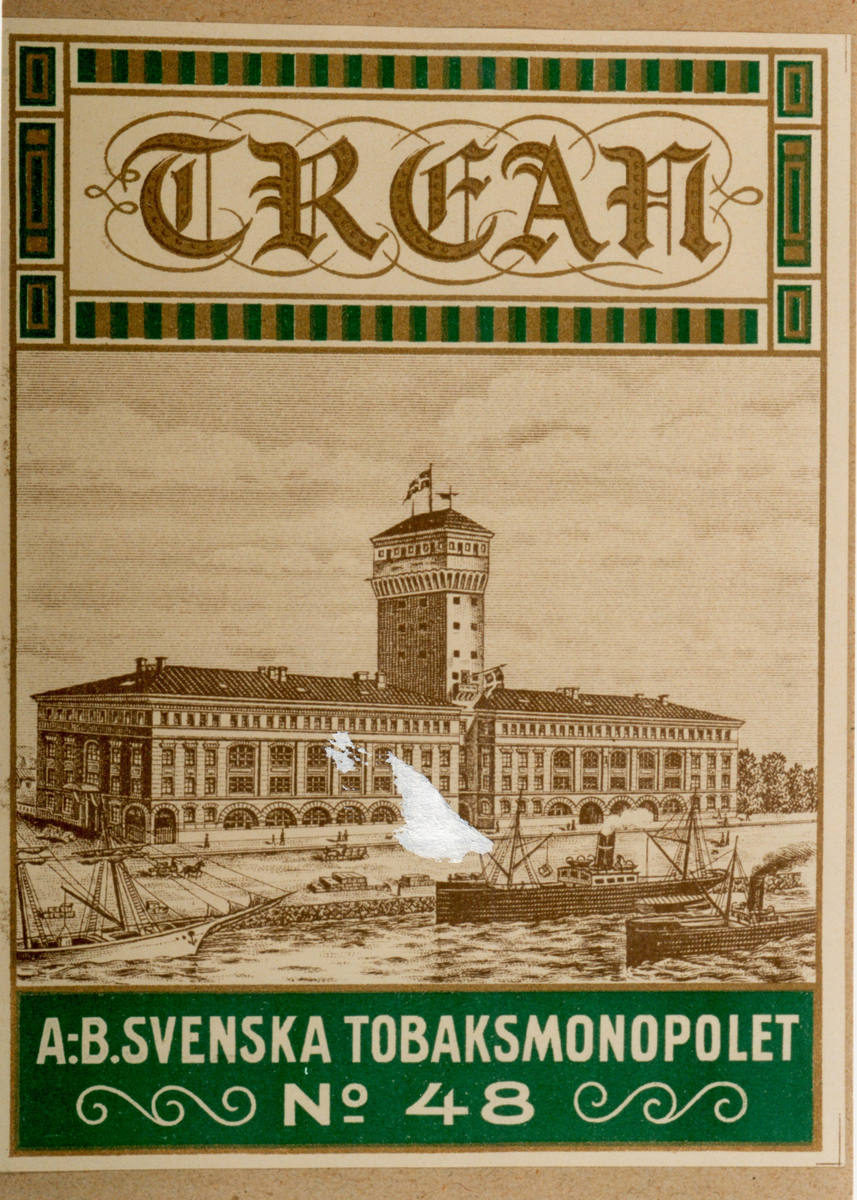 Etikett från cigarrmärket Stenbergs Trea nr 48 som producerades av AB Svenska Tobaksmonopolet.