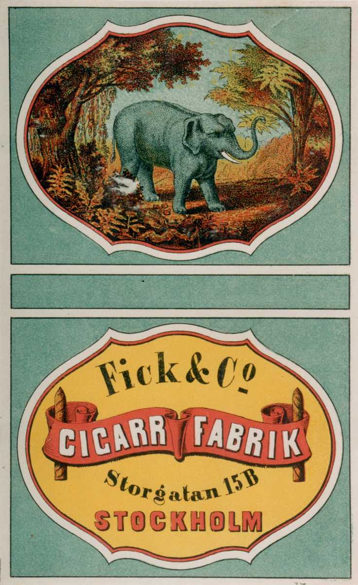 Etikett med en elefant för ett cigarrmärke tillverkat av Fick & Co. ,Stockholm.