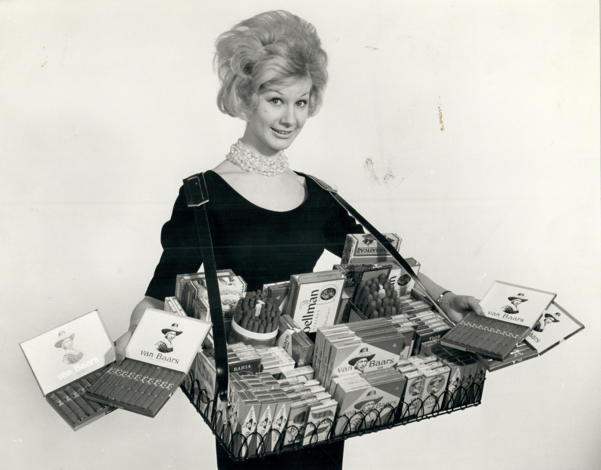 En kvinna bär på en korg med diverse tobaksprodukter i en reklambild.