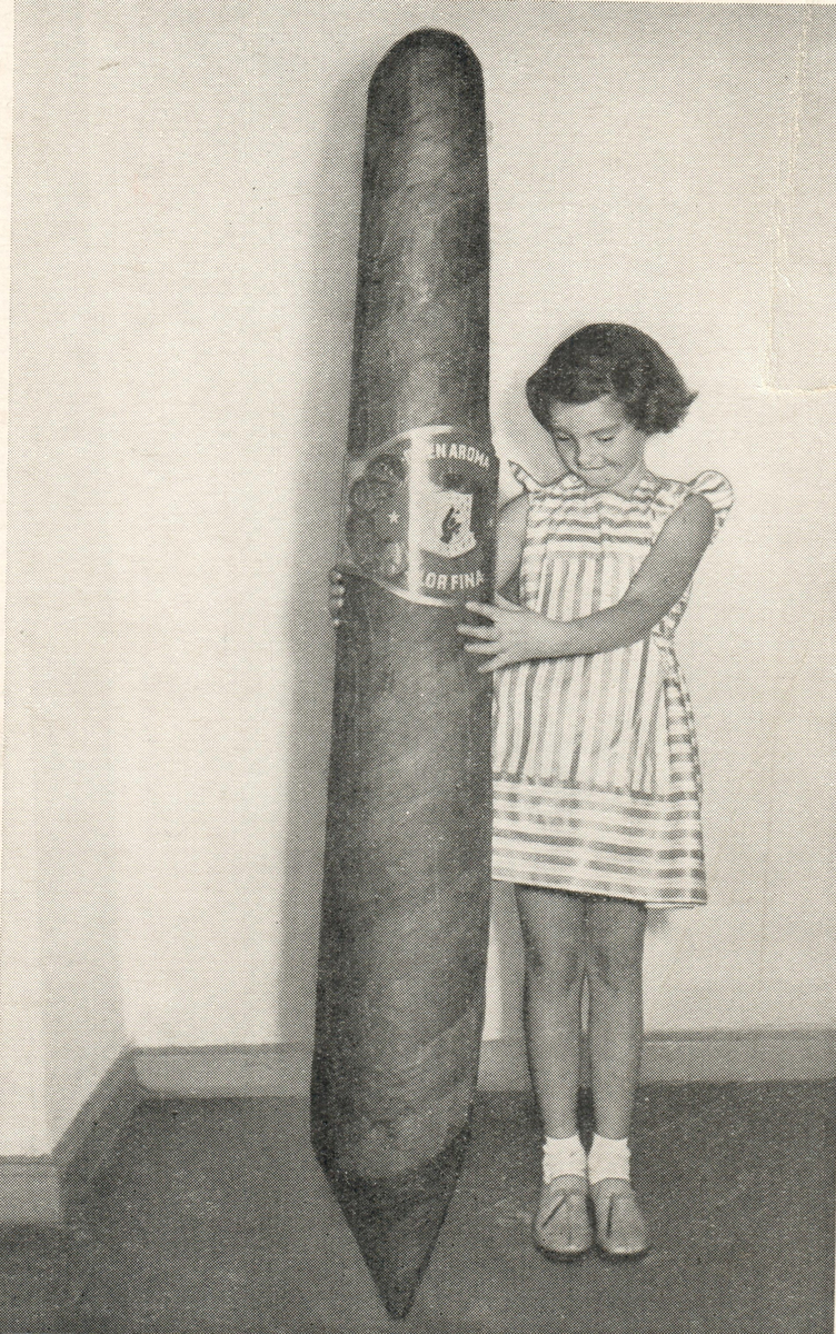 En flicka står intill en jättecigarr.