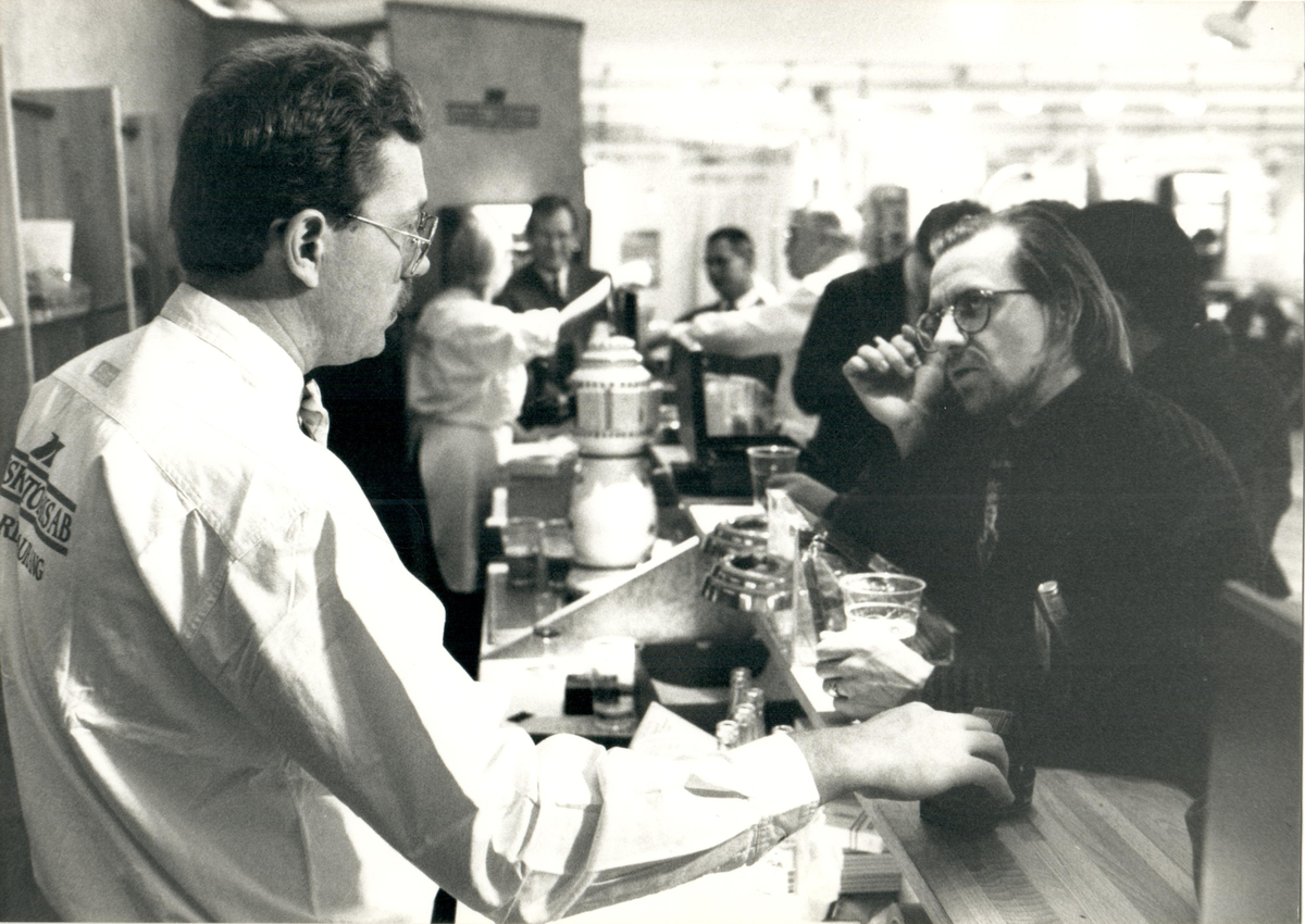 Personal från Svenska Tobaks AB i konversation med en besökare vid en cigarrmässa.