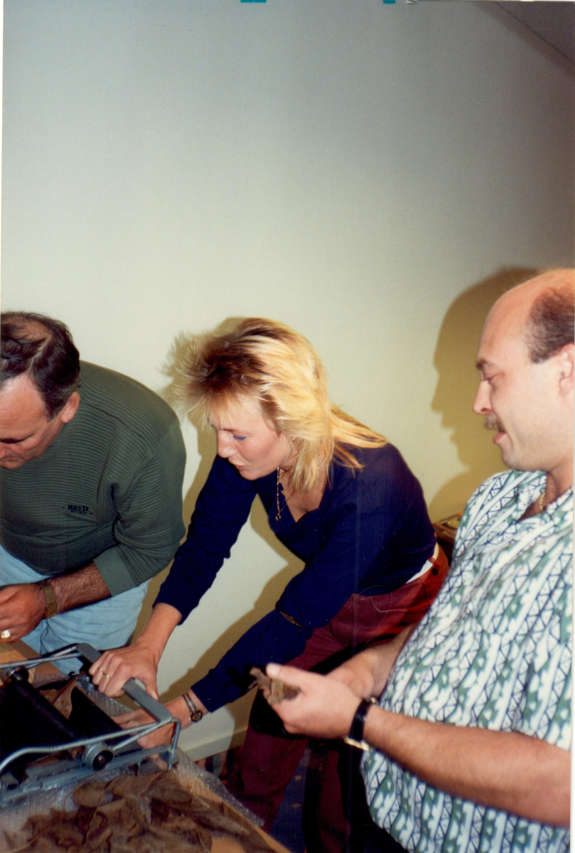Två män och en kvinna hanterar tobak vid en cigarrkurs.