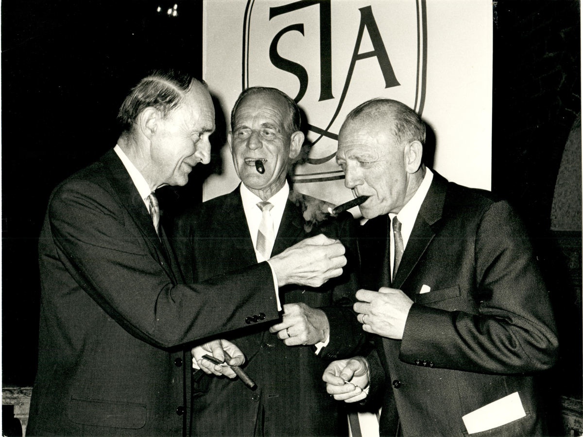 Tre män röker cigarr vid STA:s jubileumsbankett i stadshuset 1965.