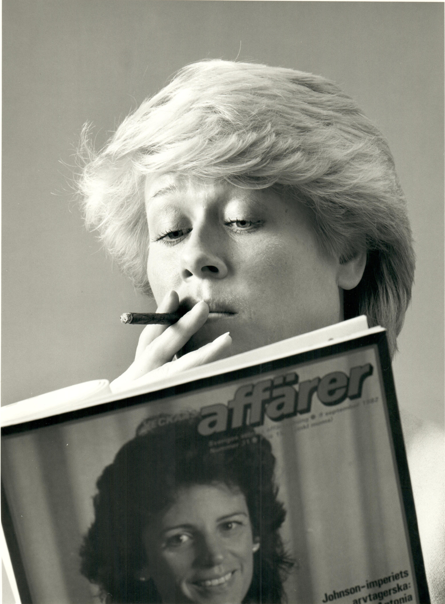 En kvinna röker en cigarill samtidigt som hon läser tidningen Veckans Affärer.
