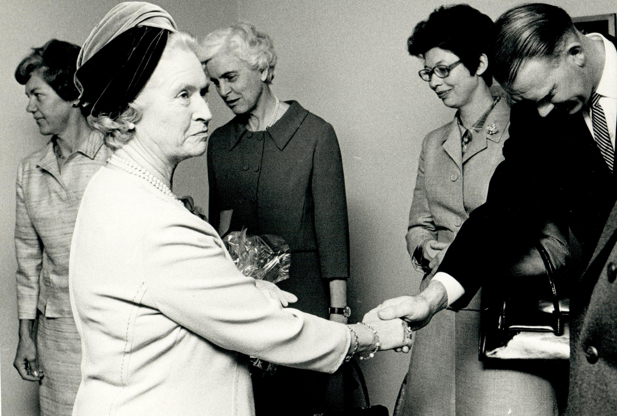 Fyra kvinnor och en man. Mannen hälsar bockande på en av kvinnorna som tittar på sidan.