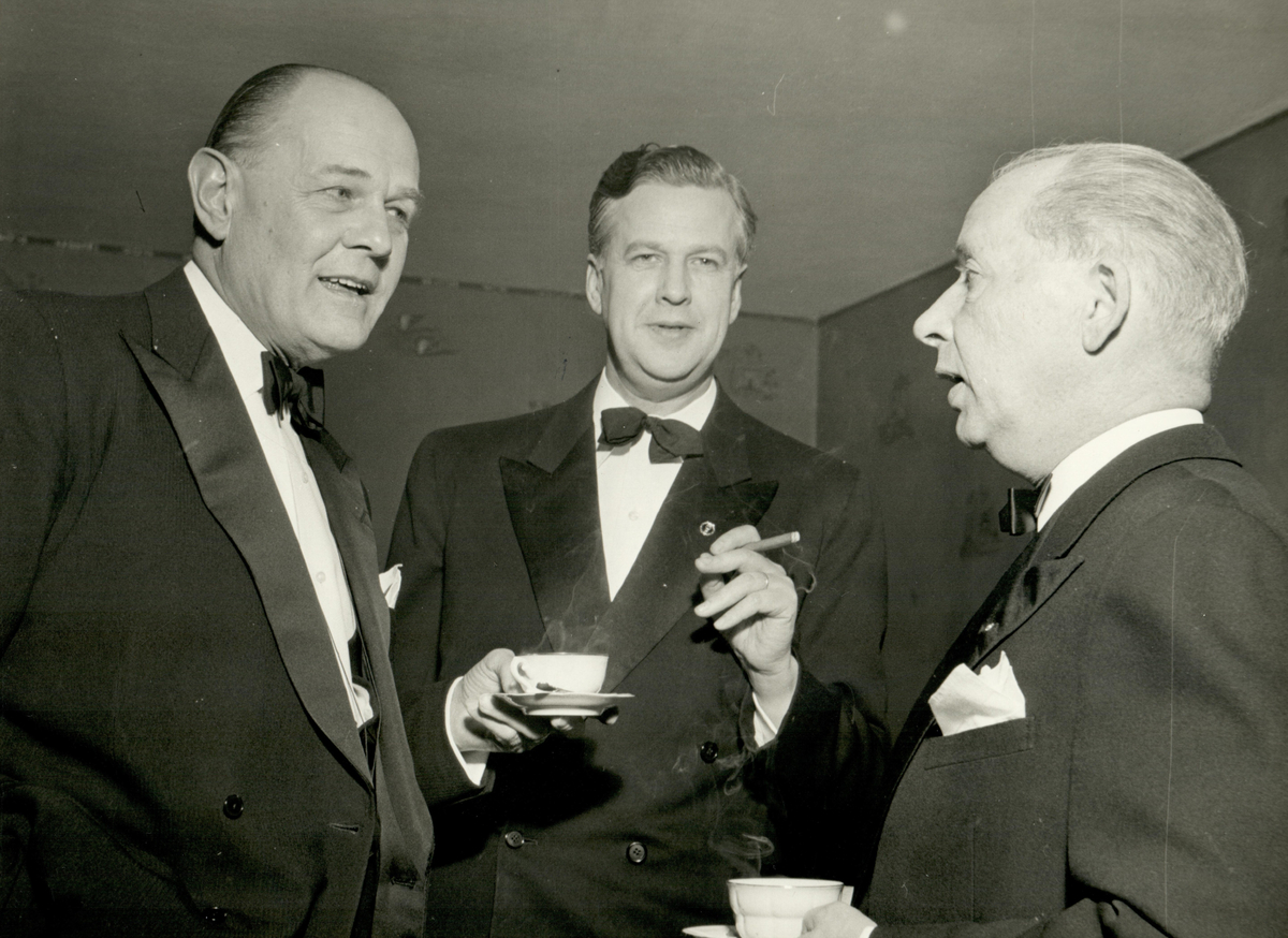 Tre män som stående samtalar. Två av männen håller i varsin kaffekopp på fat. Männen är klädda för festligare tillfälle. Mannen i mitten röker cigarr.