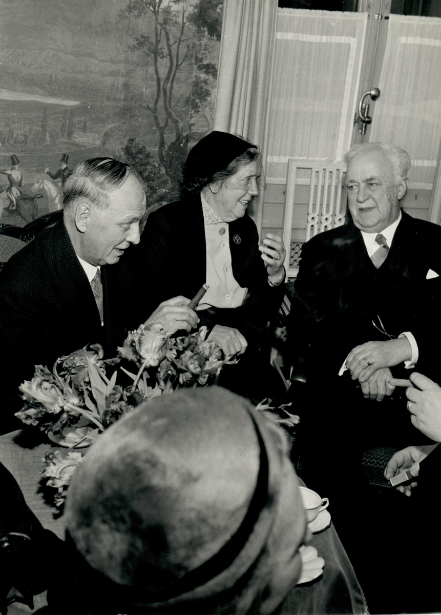 Två män och en kvinna i samtal. Mannen till vänster röker cigarr. På bordet står det kaffekopp på fat och blombuckett. Dekorativ väggmålning i bakgrunden.