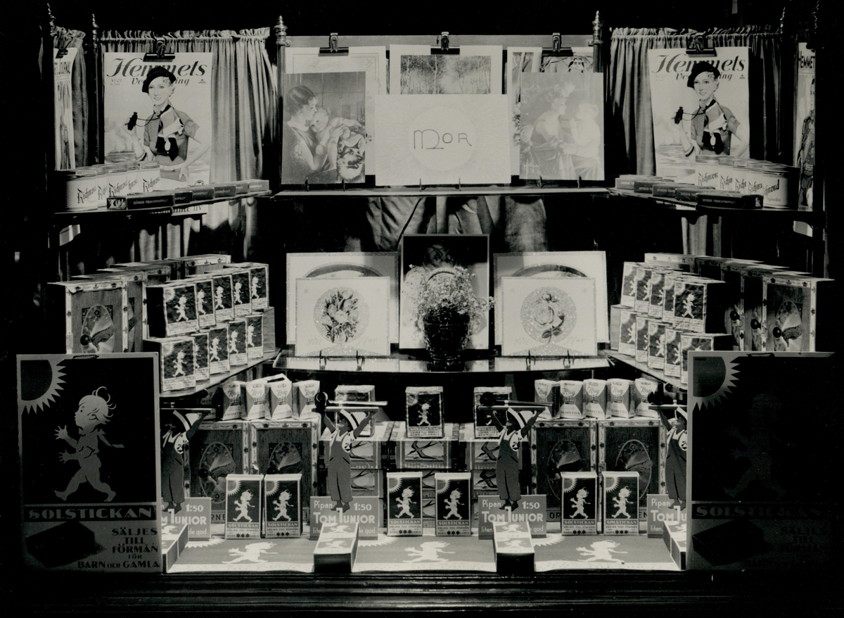 Skyltat fönster som visar Hemmets veckotidning, Solstickan och tobak.