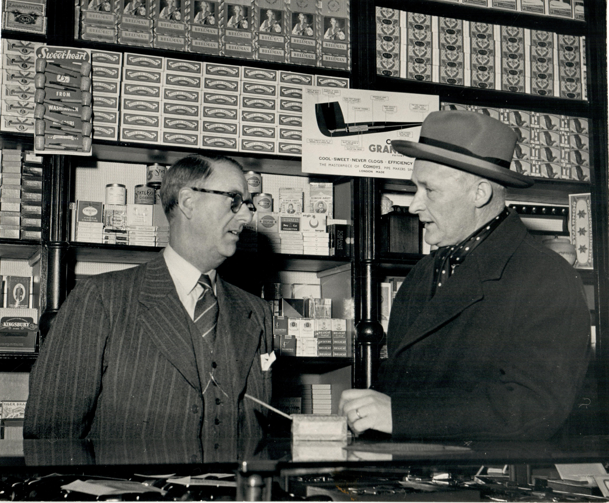 Tobakshandel, interiör. Handlare i butik. Tobaksförsäljning. Tobaksvaror.