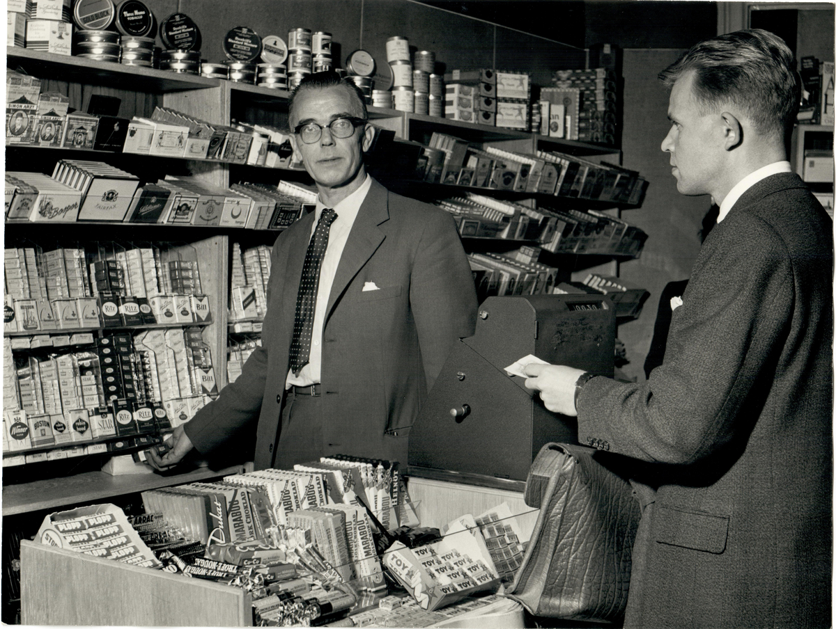 Titel: Tobakshandel, interiör. Handlare i butik. Tobaksförsäljning. Tobaksvaror.