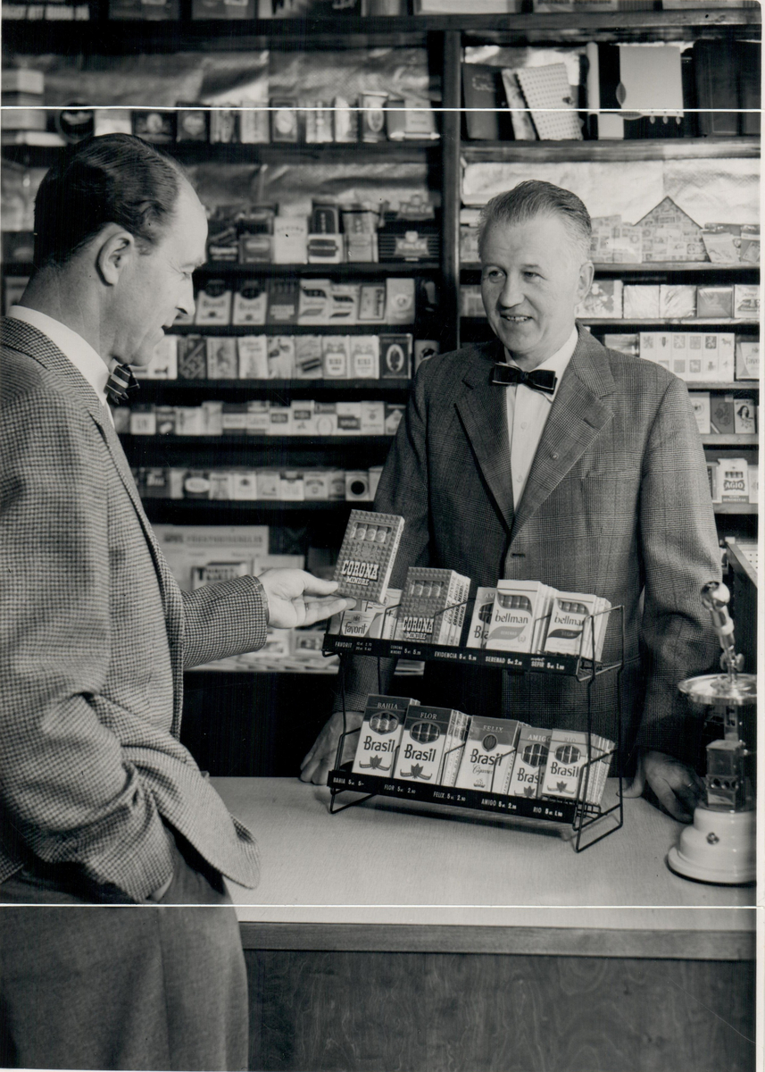 Titel: Tobakshandel, interiör. Handlare i butik. Tobaksförsäljning. Tobaksvaror.