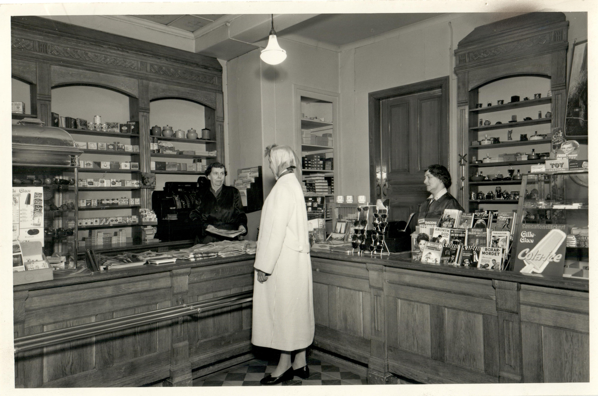 Tobakshandel, interiör. Handlare i butik. Tobaksförsäljning. Tobaksvaror.