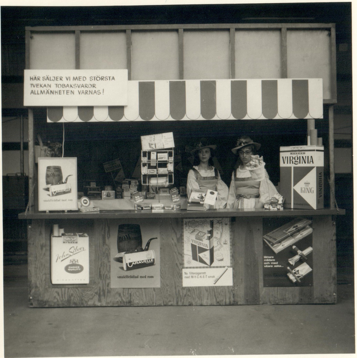 Tobakshandeln. Handlare i butiken. Tobaksvaror säljes vid stånd.