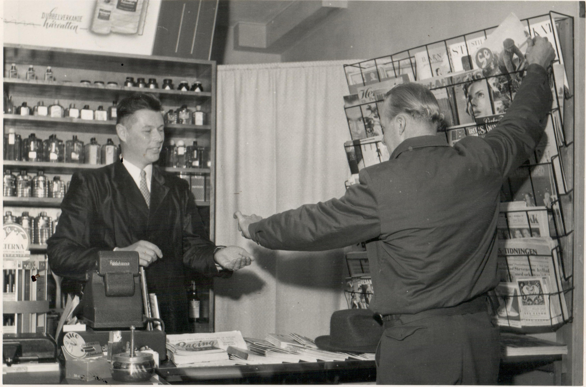 Tobakshandel, interiör. Handlare i butik. Försäljning av tobaksvaror.