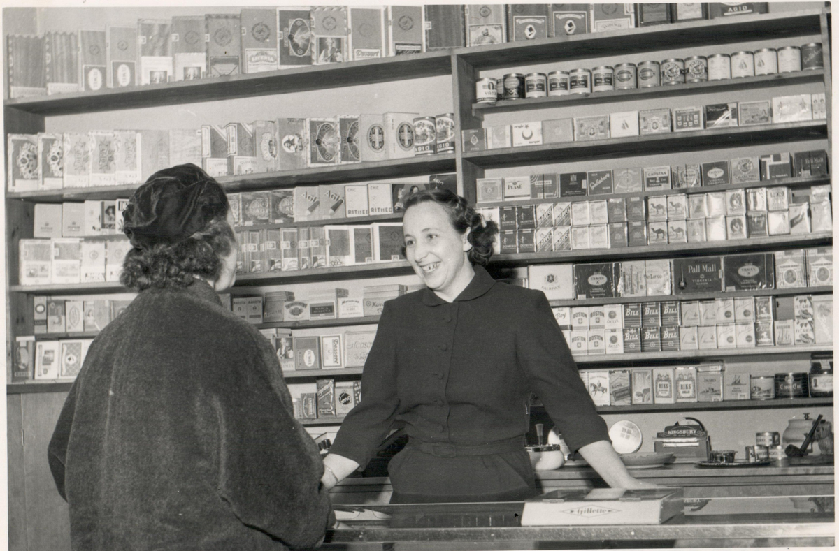 Tobakshandel, interiör. Handlare i butik. Försäljning av tobaksvaror.