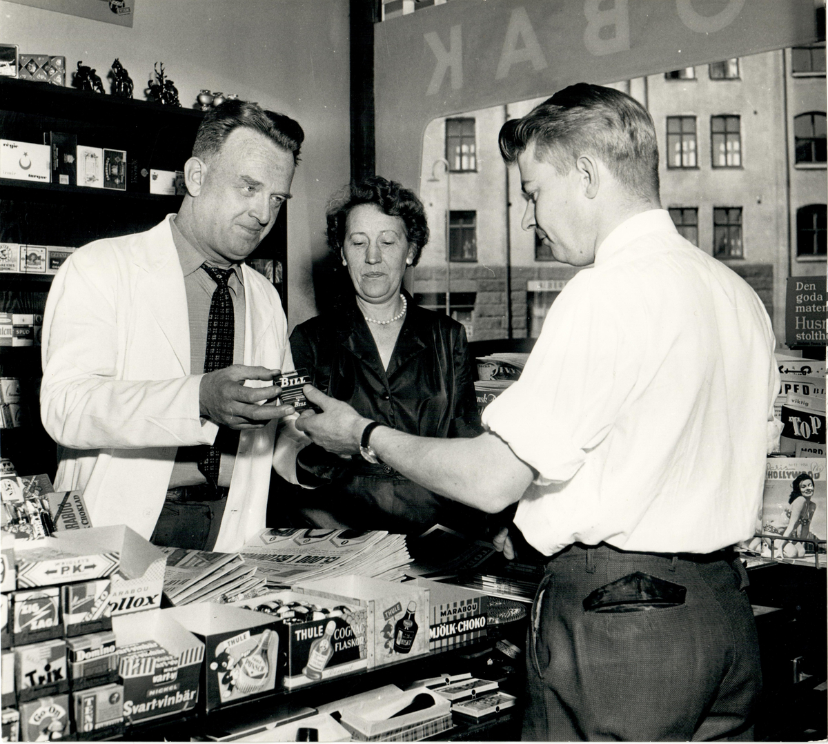 Tobakshandel, interiör. Handlare i butik. Försäljning av tobaksvaror.