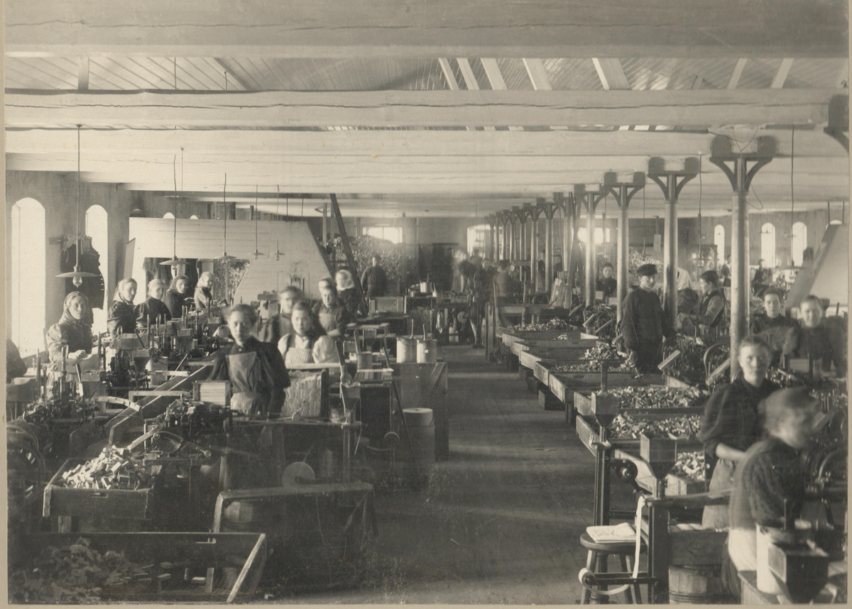 Tändsticksfabriken i Jönköping, interiör. Fabriksarbetare. Industriproduktion. Tillverkning av tändstickor.