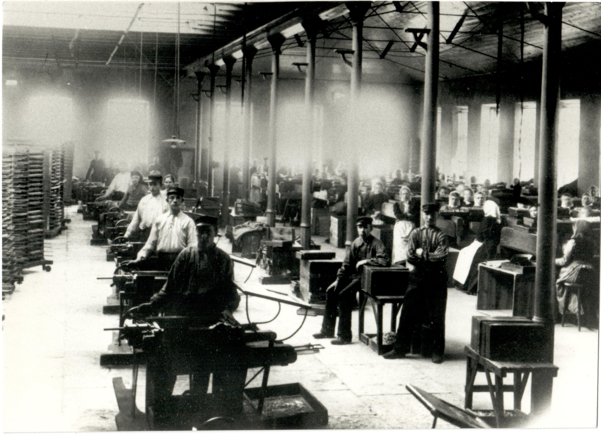 Tändsticksfabrik, interiör. Industriarbetare, tändstickstillverkning.