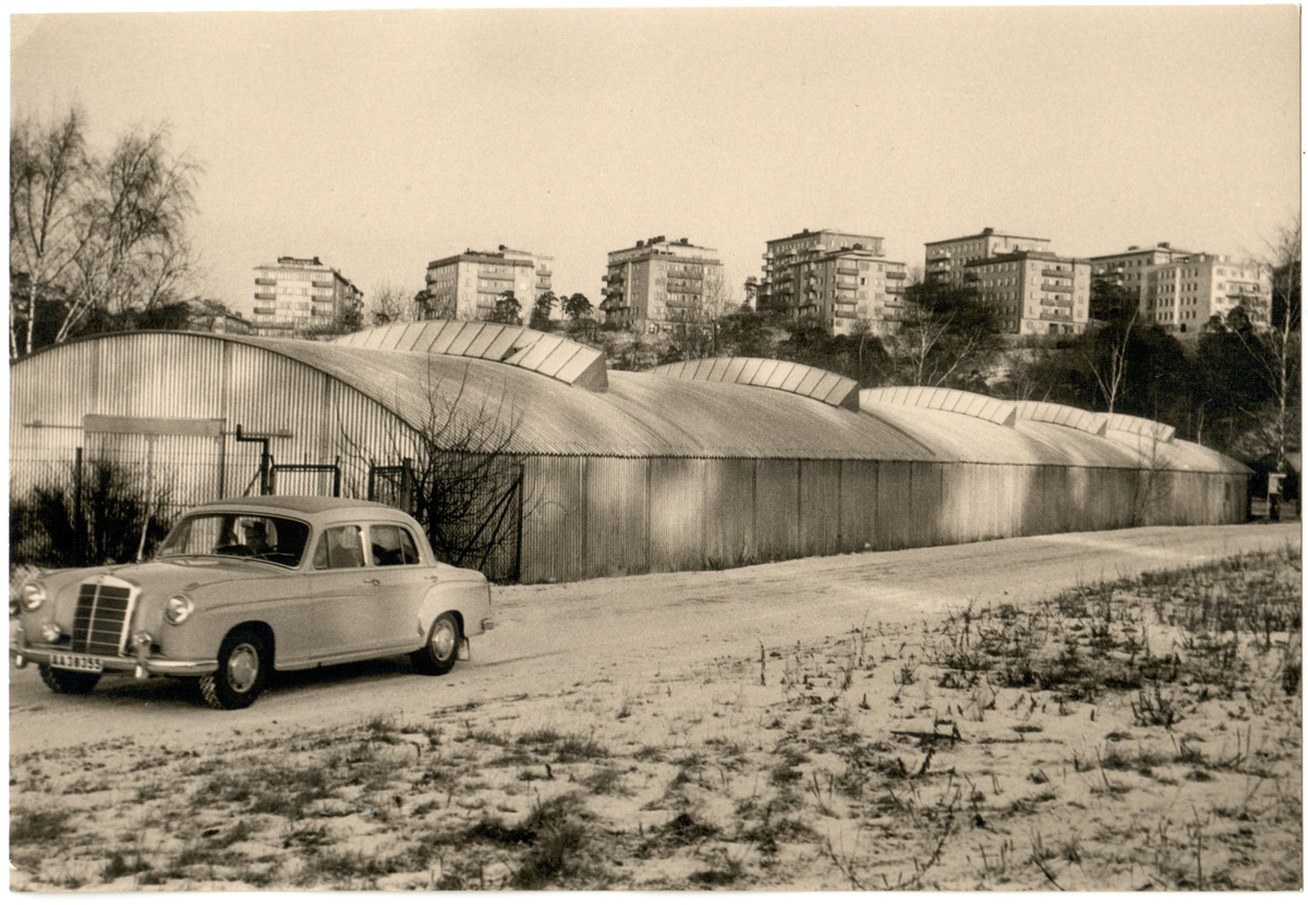 Bil kör förbi i bild, Mercedes. Stadsbild, radhus. Sverige/tändstickor. Diverse.