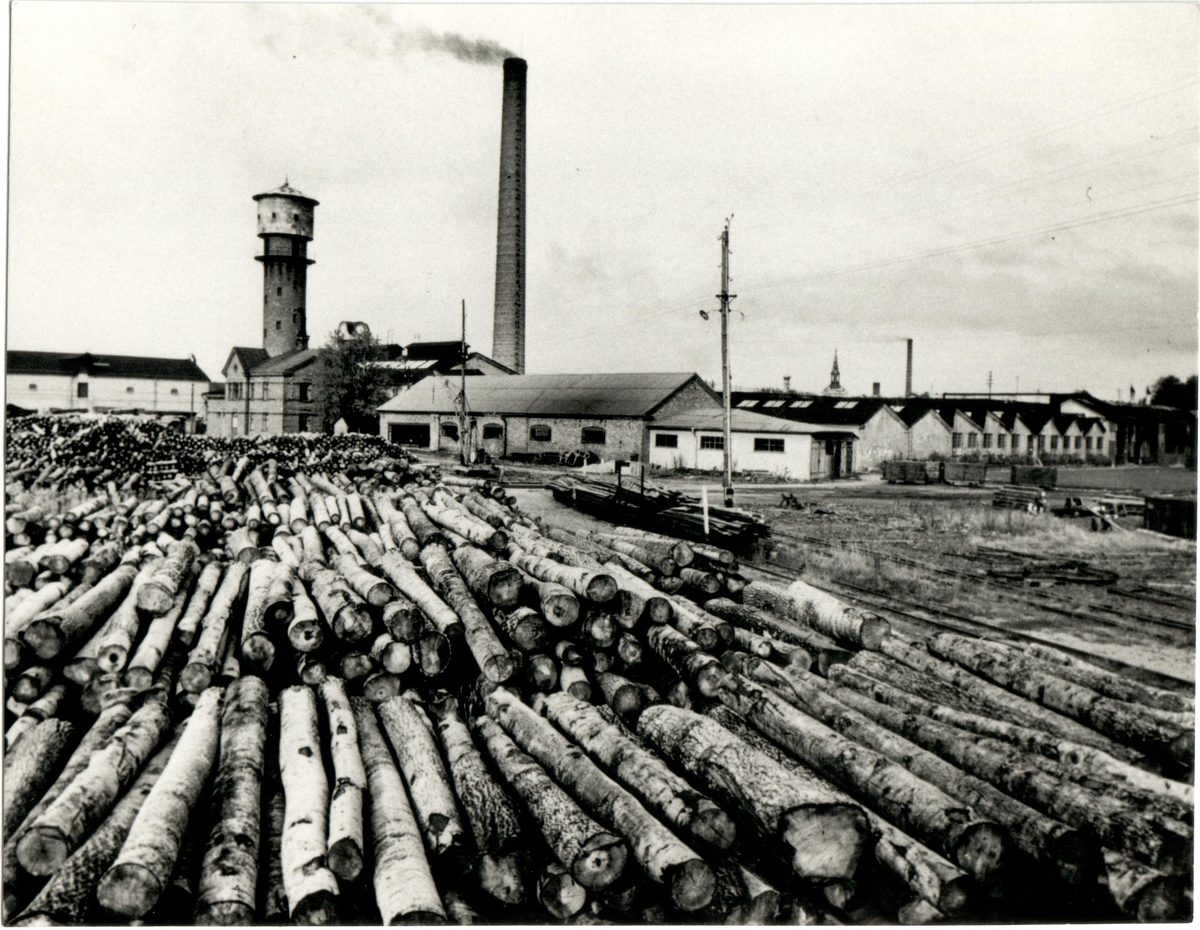 Bild över tändsticksfabrik. Vy från trästockarna. Sverige/tändstickor.