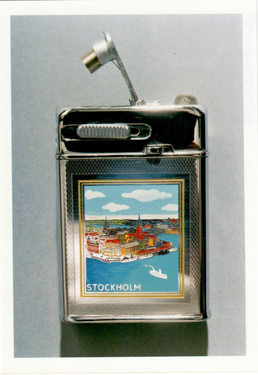 Elddon i metall. Stockholms-motiv på framsidan. Sverige/tändstickor.