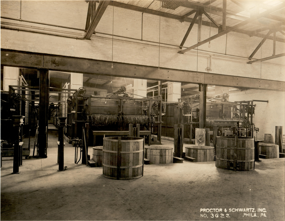 Inuti industrianläggning, torkning av tobak. Industrimaskiner tillverkade av Proctor & Schwartz.