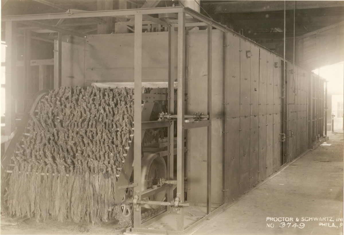 Torkning av tobak. Industrianläggning, interiör. Industrimaskin tillverkad av Proctor & Schwartz.