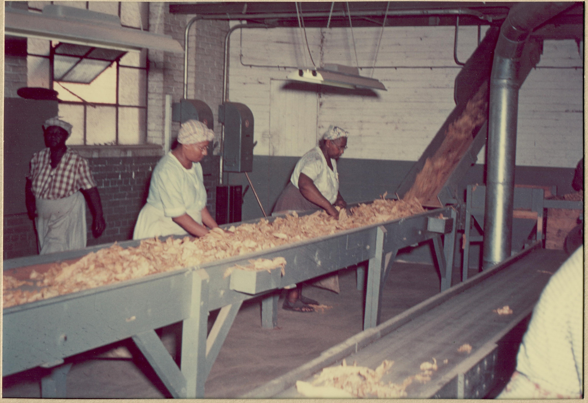 Titel: Industriarbetare hanterar tobak. Tobaksproduktion Utland USA, odling 1957.