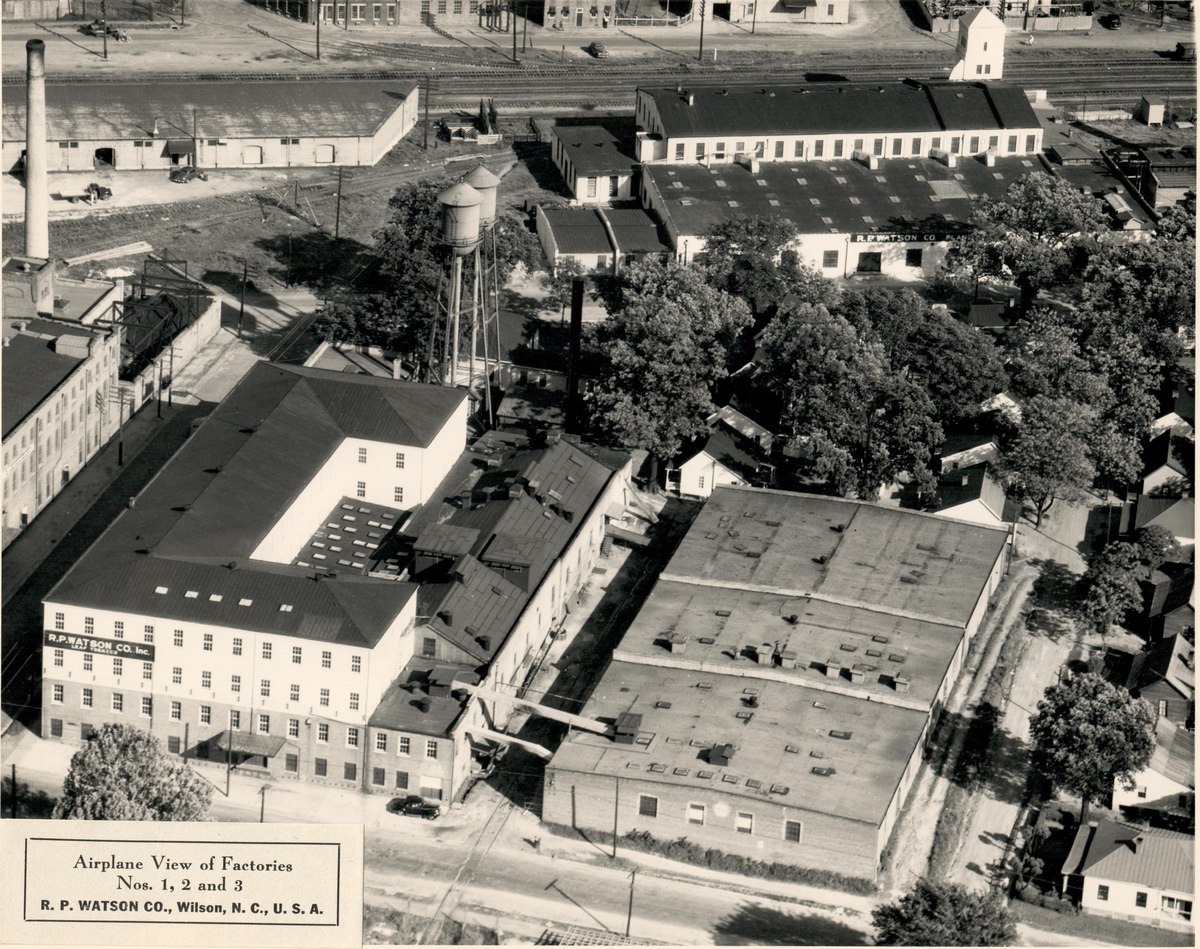 Flygfoto över R.P. Watsons tobaksfabriker. Wilson, North Carolina.