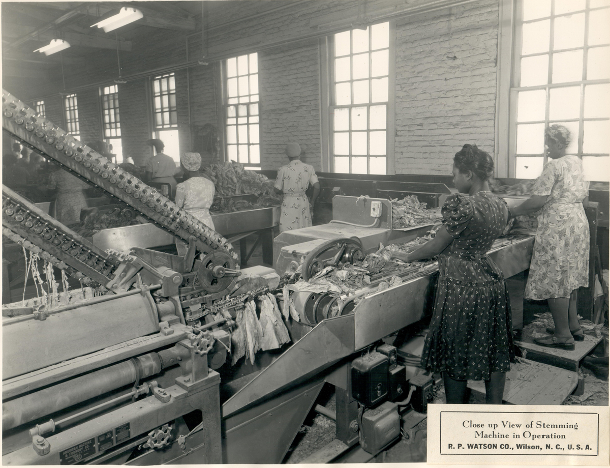 Kvinnliga arbetare vid "Stemming machines". Fabrik, interiör. Tobaksproduktion.