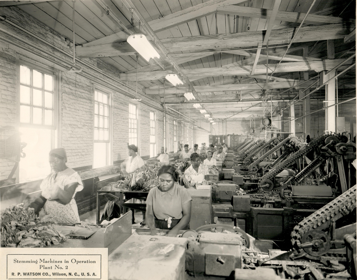 Kvinnliga arbetare vid "Stemming machines". Fabrik, interiör. Tobaksproduktion.