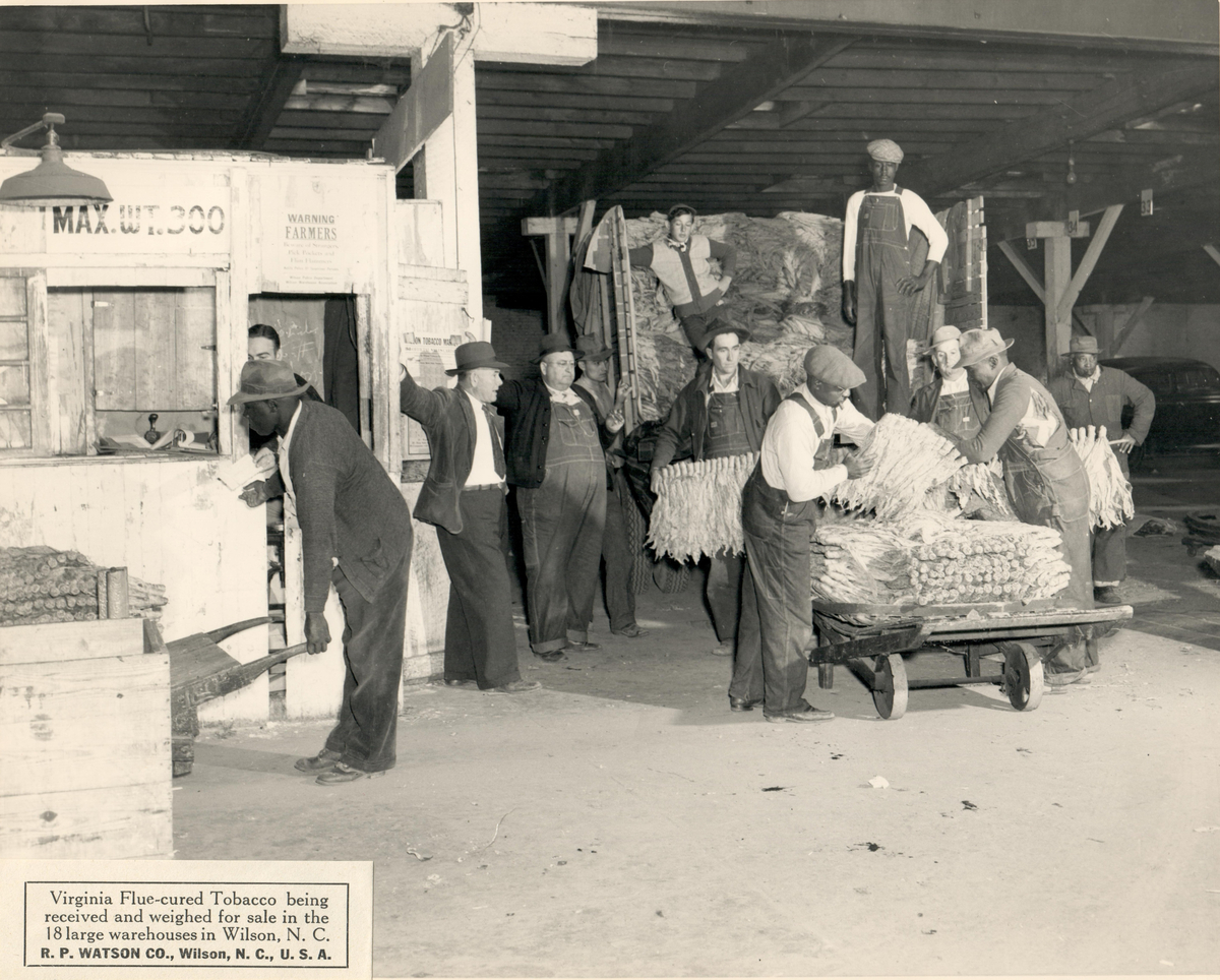 Virginiatobak tas emot och vägs upp för försäljning. Varuhus, interiör. Tobaksindustri.