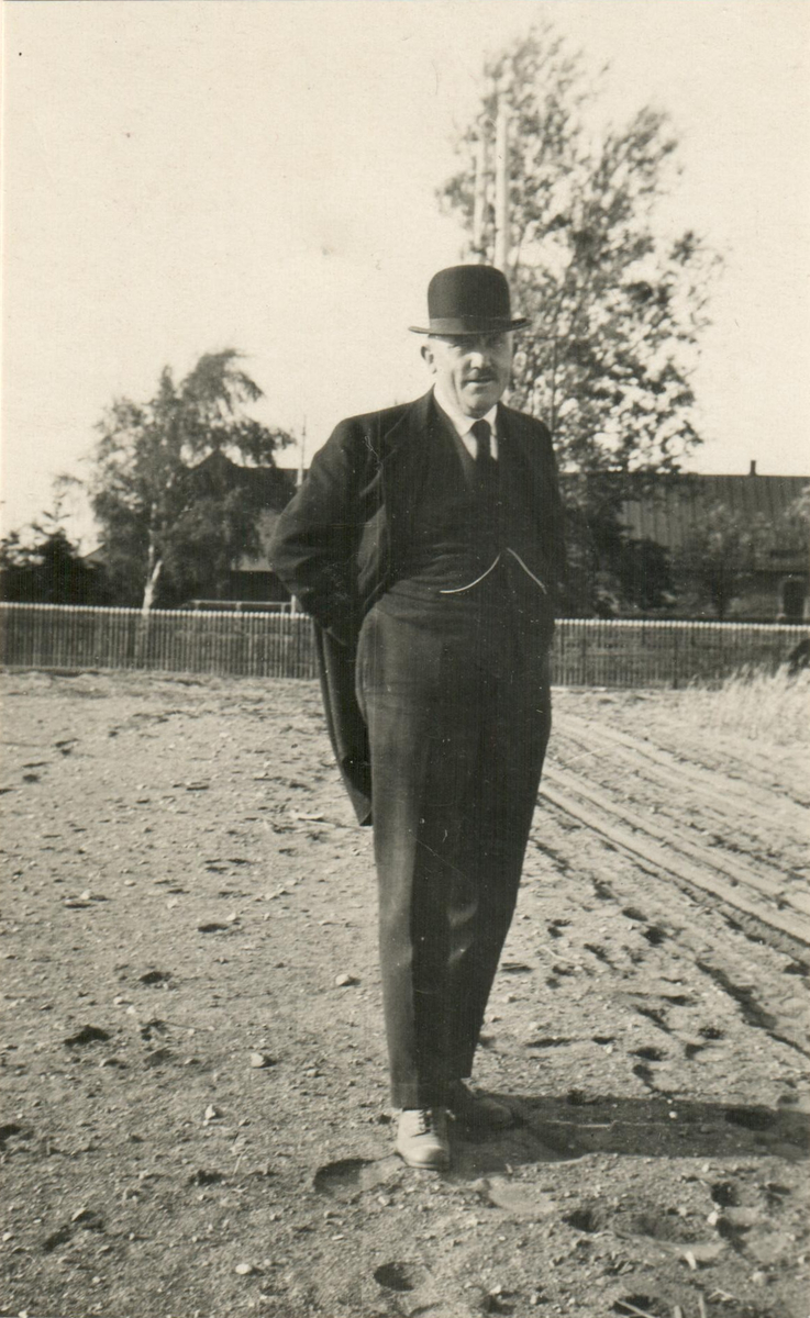En man i hatt och slips står på den jord där tobaken skall planteras.
