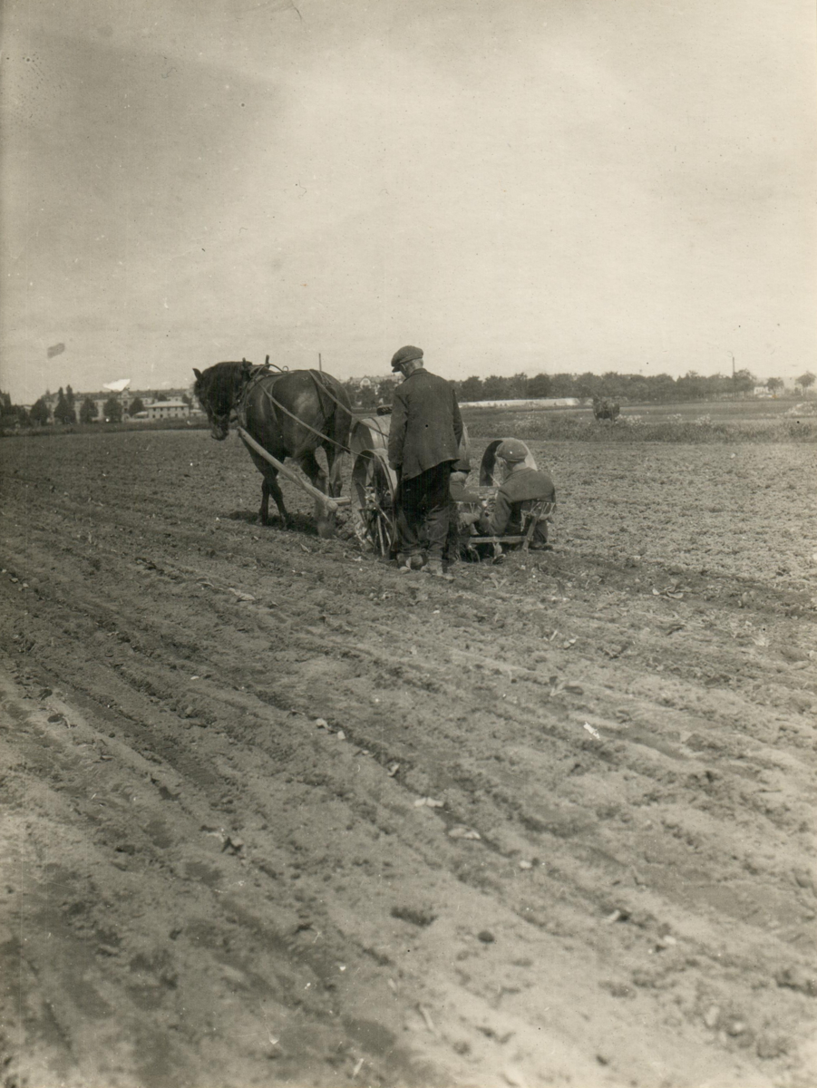 Den amerikanska planteringsmaskinen "Transplanter" dras med häst på ett tobaksfält.