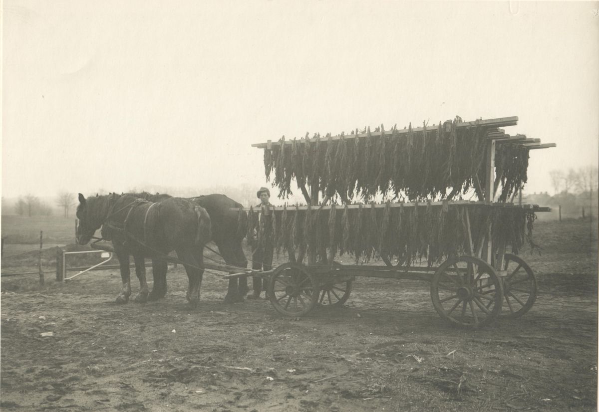 Den skördade tobaken har hängts upp på en vagn som dras av två hästar. Tobaksindustri, Sverige.