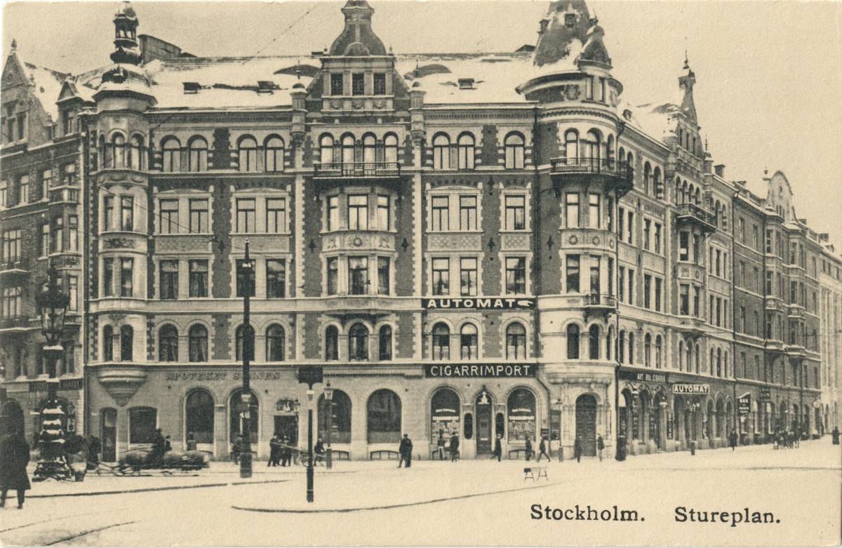 Vykort över Hugo Lundgrens Cigarrimport på Stureplan 19.