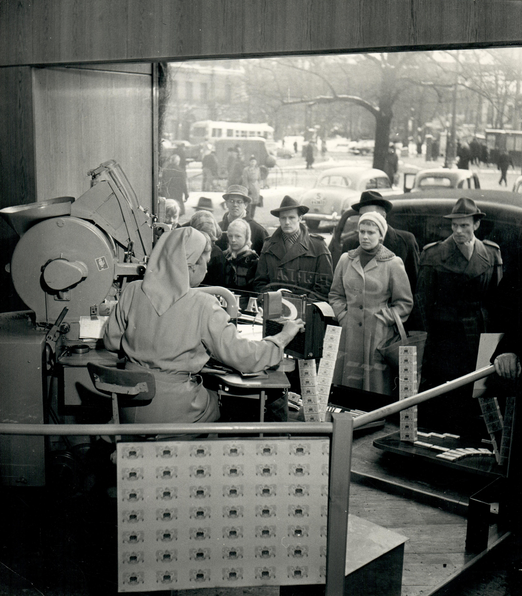 Åskådare tittar på när cigarrer paketeras vid Tobaksmonopolets tobakshandel, Norrmalmstorg.